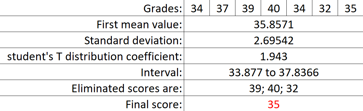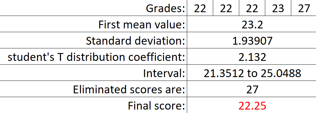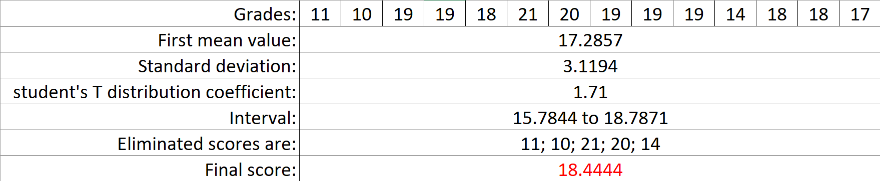 After the jury has written the scores, the average score of the contestant is calculated. For this, a special calculator is used which works according to the following principle: we take the data of the jury’s scores and by using the student’s T distribution we create a 90 percent confidence interval. After having a fixed interval, we disregard all scores which are not in this interval (we also take into account the error of the jury’s score), and then we finally calculate the mean value of the remaining scores.