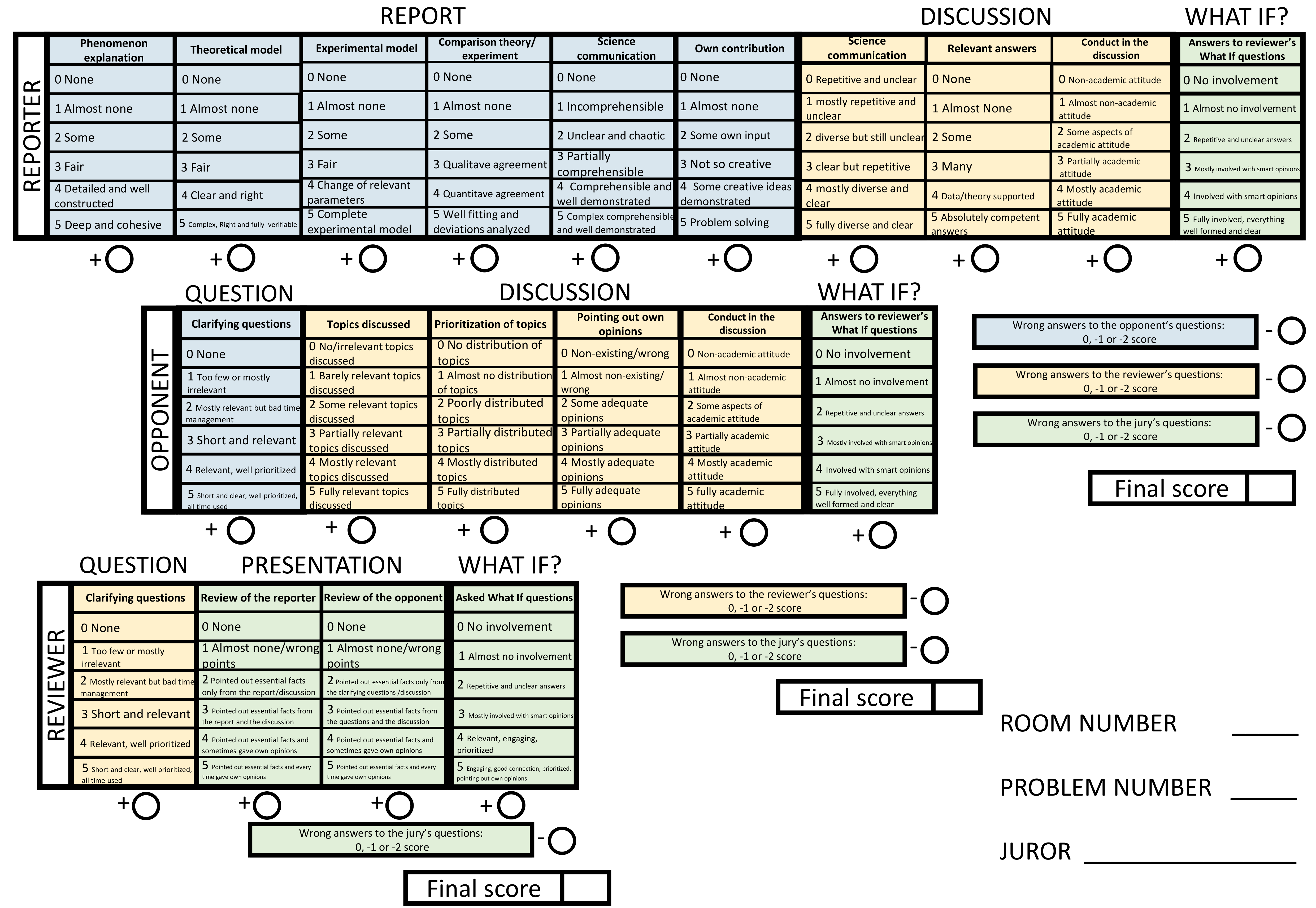 With the help of the given scoresheet, every presentation of the reporter, opponent, and reviewer will be graded according to the detailed criteria. Under each box, a jury member will put down the score in accordance with the criteria. In the case of the reporter there is a maximum score of 50 and there are 6 penalty points for the wrong answers to the opponent, reviewer and jury questions. For the opponent there is a maximum score of 30 and there are 4 penalty points for the wrong answers to the reviewer and jury questions. For the reviewer, there is a maximum score of 20 and there are 2 penalty points for the wrong answers to the jury questions. After the summation of the scores from each of the boxes, the Final Score is calculated for each contestant. The backgrounds of the boxes are colored differently so the jury will not have trouble guiding themselves through the sheet and evaluating the contestants after three different stages, during the contestant’s preparation time.