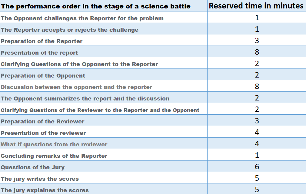 Three or four teams participate in a Science Battle, depending on the total number of teams. The Science Battle is carried out in three (or four) Stages. In each Stage, a team plays one of the three roles: Reporter, Opponent, Reviewer. The teams will switch roles throughout the fight. Each team will have each role once.